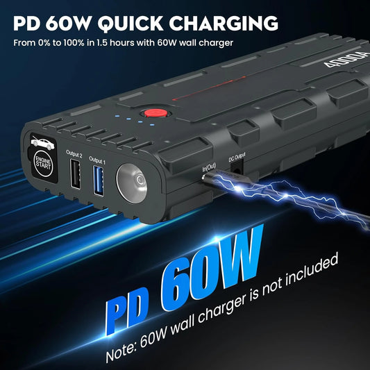 4000A Peak Car Battery Jump Starter PD60W Quick Charge